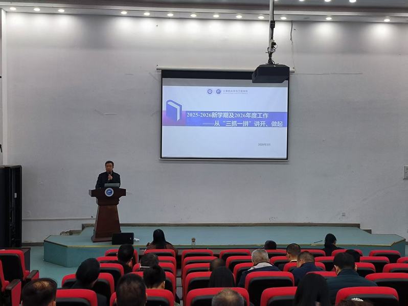 2026年3月11日,计算机科学与工程学院在宜宾校区召开新学期全体教职工大会,谋划部署新学期各项工作,统一思想、凝聚共识,为学院高质量发展谋篇布局,学院全体教职工参加会议,会议由学院党委书记张潇文主持。